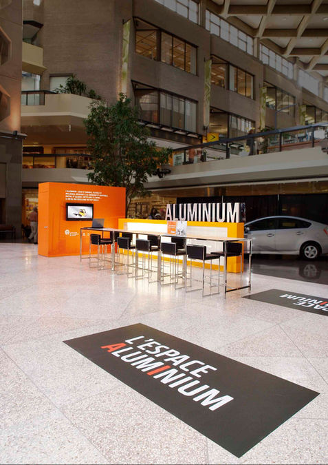 Pour le pavillon itinérant, nous avons choisi d’exprimer les deux principales qualités de l’aluminium, soit la force et la légèreté. Ce pavillon accueille toute une partie informative sur la nature de l’aluminium et son usage au quotidien. Pour le muret de positionnement, le mot ALUMINIUM en grandes lettres permet d’avoir une visibilité perçue de très loin sur la mezzanine. L’assemblage de tous les composants de ce kiosque donne un espace dynamique et versatile.
