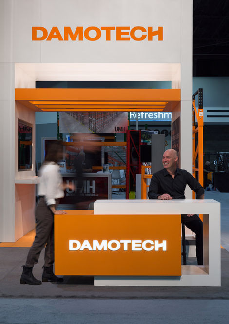 Les délais très courts ont été le défi majeur dans la conception du stand. Il a fallu proposer rapidement un concept engageant et respectant le branding fort et accrocheur de Damotech. Le client avait deux idées précises de ce qu’il désirait: permettre une circulation fluide et instructive des visiteurs parmi les produits et se démarquer visiblement de leurs concurrents directs.